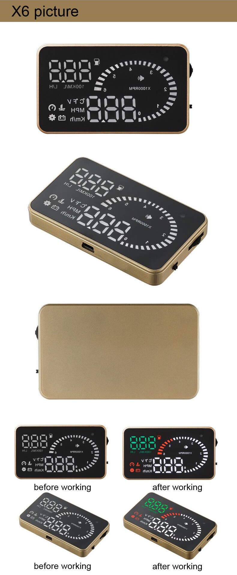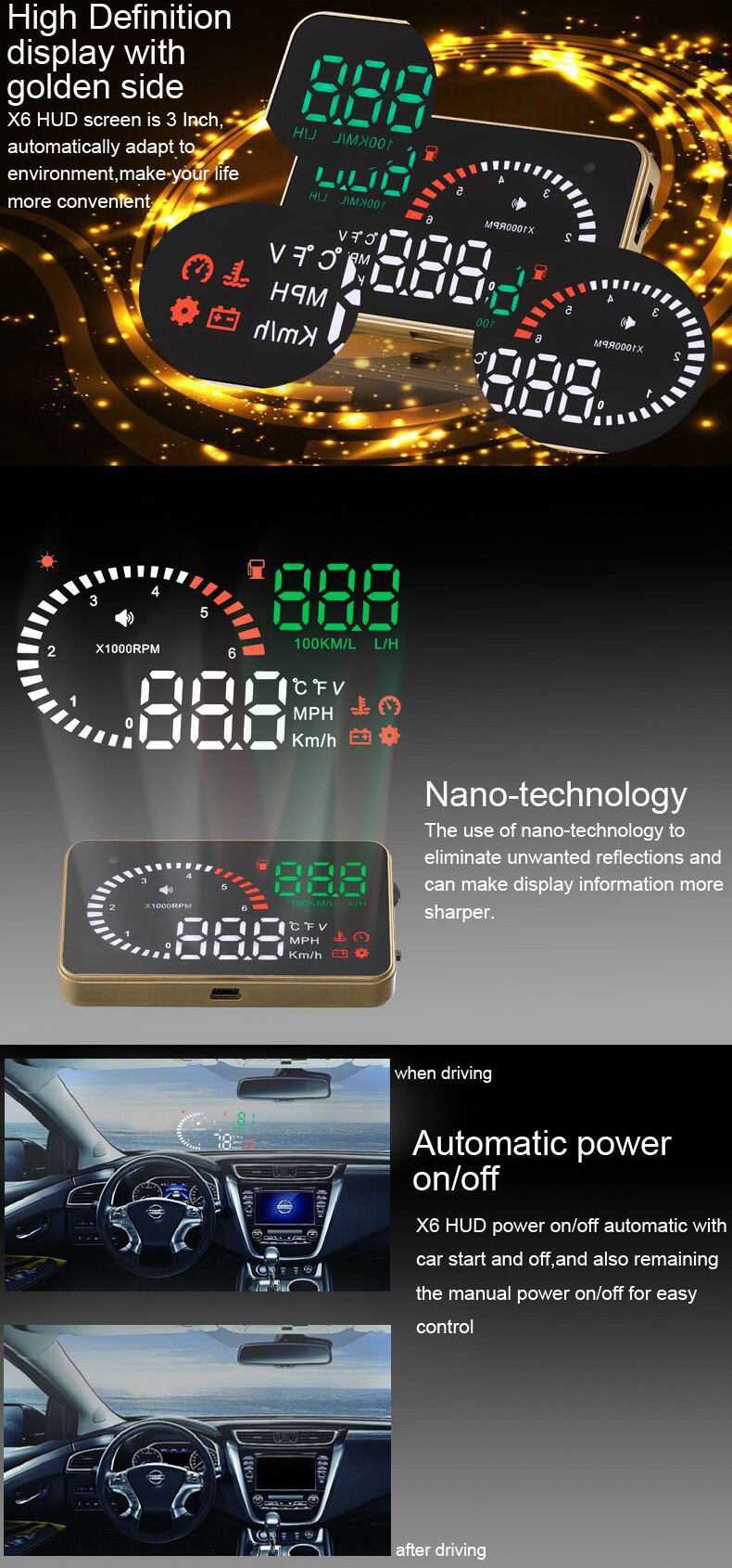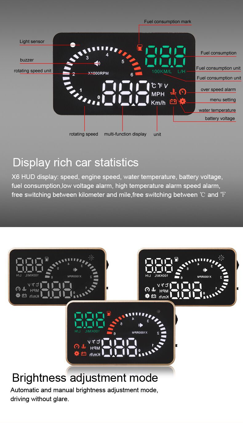 6. Auto power on and off with vehicle started and shutdown, effective protection of the car battery; while retaining the manual switch mode, and more easy to control HUD.