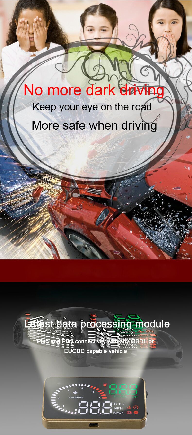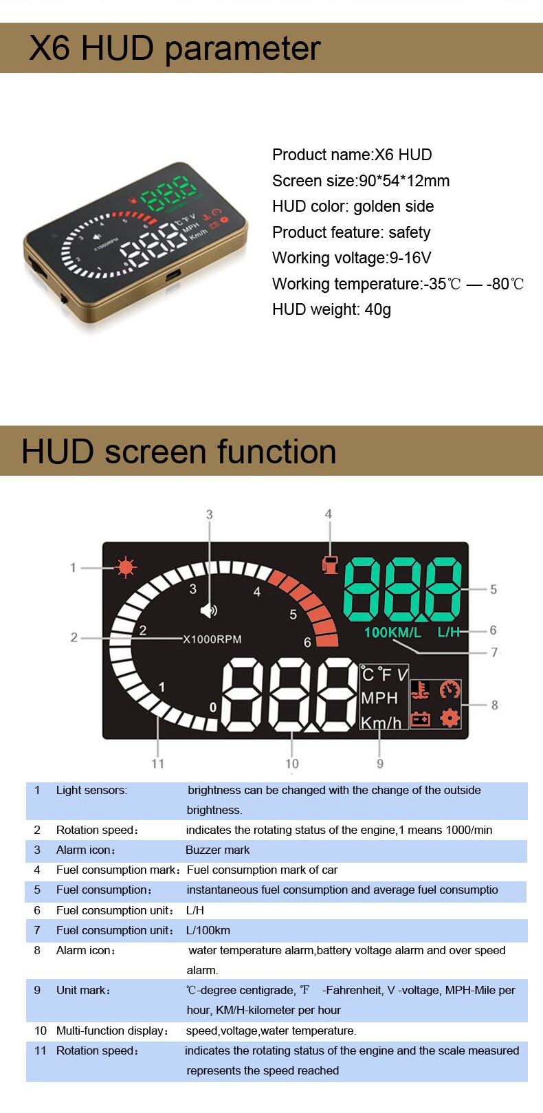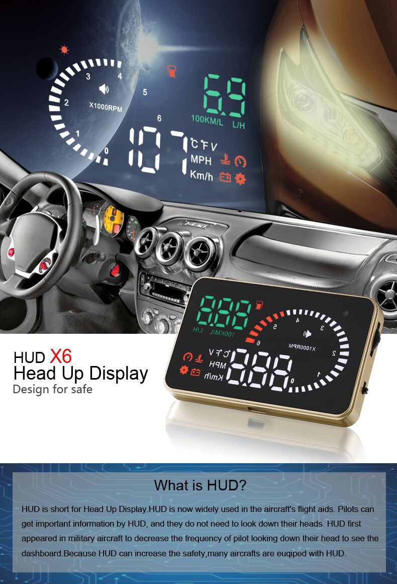 This product is for drivers’ safety, especially in high-speed driving at night, HUD can keep driver eyes on the road and can decrease car accident. HUD can project the important information (such as speed) onto the windshield, it can help inexperienced novice to control their speed and to avoid speeding violation in the speed limit road. More importantly, it enables the driver instantly read the number in great vision and always make drivers eyes on the road in clear mind.